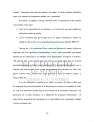 nombre y desempeña otras funciones ajenas a su trabajo. Al fungir cualquier institución como aval, adquiere un compromiso también con la comunidad. De acuerdo a la segunda faceta que plantea Castillo, las promotoras de PA cumplen con su trabajo como sigue: Frente a los responsables de las decisiones en el nivel local, para que establezcan políticas favorables de salud y, Con la comunidad, para que las personas y los grupos contribuyan a mejorar su calidad de vida, es decir, poner en práctica el empoderamiento (Castillo 2004, 39). Para que las y los promotores lleven a cabo sus funciones de manera óptima, es importante que sean capacitados constantemente, es decir, estén actualizados para brindar información de calidad que se vea reflejada en las participantes. Al respecto se comenta: “El capacitar más a cada persona para que cuide de su propia salud debe ser la meta principal de cualquier actividad o programa de salud. Si la gente recibe información clara y sencilla, ella misma puede evitar y tratar sus problemas más frecuentes de salud, más pronto, a menor costo y muchas veces mejor de lo que lo hacen los médicos” (Fajardo y Werner 1998, 92). El uso de trabajadores comunitarios de salud o promotores de salud, es ideal para los programas de prevención primaria de la diabetes que se centran en los cambios de estilo de vida. Los promotores brindan mayor conocimiento de la comunidad, dedicación a la promoción de la salud, asistencia en la adaptación del programa culturalmente y el conocimiento personal de las experiencias de la enfermedad de sus comunidades (Swider 2002 cit. en Staten 2005). 128