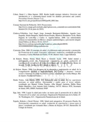 Cohen, Stuart J. y Maia Ingram. 2005. Border health strategic initiative: Overview and introduction to a community-based model for diabetes prevention and control. Preventing Chronic Disease 2 (1). http://www.cdc.gov/pcd/issues/2005/jan/04_0081.htm Consejo Nacional de Población. 2010. Proyecciones. http://www.conapo.gob.mx/index.php?option=com_content&view=article&id=36& Itemid=234 (18 de junio de 2010). Córdova-Villalobos, José Ángel, Jorge Armando Barriguete-Meléndez, Agustín Lara- Esqueda, Simón Barquera, Martín Rosas-Peralta, Mauricio Hernández-Ávila, María Eugenia de León-May y Carlos A. Aguilar-Salinas. 2008. Las enfermedades crónicas no transmisibles en México: sinopsis epidemiológica y prevención integral. Salud Pública de México 50 (5): 419-27. http://www.scielosp.org/scielo.php?script=sci_arttext&pid=S0036- 36342008000500015&lng=en&nrm=iso. Czeresnia, Dina. 2006. El concepto de salud y la diferencia entre prevención y promoción. En Promoción de la salud. Conceptos, reflexiones, tendencias, coordinado por Dina Czeresnia y Carlos Machado de Freitas, 47-64. Buenos Aires: Lugar Editorial. de Keijzer, Benno, Emma María Reyes y Gerardo Ayala. 1998. Salud mental y participación social. En Participación comunitaria en salud: evaluación de experiencias y tareas para el futuro, coordinado por Armando Haro y Benno de Keijzer, 224-46. Hermosillo: El Colegio de Sonora. de Keijzer, Benno. 2004. Los discursos de la educación y participación en salud: de la evangelización sanitaria al empoderamiento. En Críticas e Atuantes: ciencias sociais e humanas em saúde na América Latina, compilado por Cecilia Minayo. Río de Janeiro: Fundación Fiocruz. Durán Fontes, Luis Rubén. 2006. XX. Educación para la salud. En La experiencia mexicana en salud pública. Oportunidad y rumbo para el tercer milenio, coordinado por Manuel Urbina Fuentes, Alba Moguel Ancheita, Melba Elena Muñiz Martelón y José Antonio Solís Urdaibay, 345-55. México: FCE, Secretaría de Salud, OPS, SMSP, FunSalud, INSP. Epp, Jake. 1996. Lograr la salud para todos: un marco para la promoción de la salud. En Promoción de la salud: una antología, Organización Panamericana de la Salud, 25- 36. Washington, D.C.: Organización Panamericana de la Salud. Fajardo, Roberto y David Werner. 1998. Salud rural autogestiva: El proyecto Piaxtla. En Participación comunitaria en salud: evaluación de experiencias y tareas para el futuro, coordinado por Armando Haro y Benno de Keijzer, 89-103. Hermosillo: El Colegio de Sonora. 132