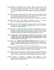Flegal, Katherine M., Margaret D. Carrol, Cynthia L. Ogden y Lester R. Curtin. 2010. Prevalence and Trends in Obesity Among US Adults, 1999-2008 . The Journal of the American Medical Association 303 (3): 235-41, http://jama.ama- assn.org/cgi/content/full/303/3/235?ijkey=ijKHq6YbJn3Oo&keytype=ref&siteid=a majnls. García Ospina, Consuelo y Ofelia Tobón Correa. 2000. Promoción de la salud, prevención de la enfermedad, atención primaria en salud y plan de atención básica ¿qué los acerca? ¿qué los separa? Hacia la Promoción de la Salud 5: 1-17. http://promocionsalud.ucaldas.edu.co/index.php?option=content&task=view&id=46 . Gerberding, Julie Louise. 2005. Diabetes: incapacitante, mortal y en aumento. http://www.cdc.gov/diabetes/spanish/glance.htm (7 de enero de 2010). González-Molina, Julio. 2004. Promoción de la salud para todos. En Salud comunitaria y promoción de la salud, coordinado por Mariano García Viveros, 13-36. México: Universidad de la Ciudad de México. Grau Ábalo, Jorge A. 1998. La psicología de la salud y las enfermedades crónicas: un paradigma del trabajo futuro. En La Psicología de la Salud en América Latina, coordinado por Graciela Rodríguez Ortega y Mario E. Rojas Rusell, 47-60. México: Facultad de Psicología; Universidad Nacional Autónoma de México, Porrúa. Gundermann Kroll, Hans. 2001. El método de los estudios de caso. En Observar, escuchar y comprender sobre la tradición cualitativa en la investigación social, coordinado por María Luisa Tarrés, 251-86. México: Porrúa, El Colegio de México, Facultad Latinoamericana de Ciencias Sociales. Haro Encinas, Jesús Armando. 2000. Cuidados profanos: una dimensión ambigua en la atención de la salud. En Medicina y cultura. Estudios entre la antropología y la medicina, editado por Enrique Perdiguero y Josep M. Comelles, 101-62. España: Bellaterra. Hernández Tezoquipa, Isabel, María de la Luz Arenas Monreal y Rosario Valde Santiago. 2001. El cuidado a la salud en el ámbito doméstico: interacción social y vida cotidiana. Revista Saúde Pública 35 (5): 443-50. www.fsp.usp.br/rsp. Heron, Melonie, Donna L. Hoyert, Sherry L. Murphy, Jiaquan Xu, Kenneth D. Kochanek y Betzaida Tejada-Vera. 2009. Deaths: Final data for 2006. National vital statistics reports 57 (14): 1-135. http://www.cdc.gov/nchs/data/nvsr/nvsr57/nvsr57_14.pdf. Instituto Nacional de Estadística y Geografía. 2010. Esperanza de vida. http://www.inegi.org.mx/est/contenidos/espanol/soc/sis/sisept/default.aspx?t=mpob 56&c=3233&e= (13 de abril de 2010). 133