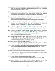 Kickbusch, Ilona. 1996. El autocuidado en la promoción de la salud. En Promoción de la salud: una antología, Organización Panamericana de la salud, 235-45. Washington: Organización Panamericana de la Salud. Málaga, Hernán y Marta Lucía Castro Ramírez. 2001. Cómo empoderar a los excluidos en el nivel local. En Promoción de la Salud. Cómo construir vida saludable, coordinado por Helena Restrepo, 120-138. Bogotá: Médica Panamericana. Menéndez, Eduardo L. 1984. Estructura y relaciones de clase y la función de los modelos médicos. Nueva Antropología VI (23): 71-102. http://www.juridicas.unam.mx/publica/librev/rev/nuant/cont/23/cnt/cnt6.pdf. Menéndez, Eduardo L. 2006. Participación social en salud: las representaciones y las prácticas. En Participación social ¿para qué?, coordinado por Eduardo L. Menéndez y Hugo G. Spinelli, 81-116. Buenos Aires: Lugar Editorial. Mercado, Francisco, Leticia Robles, Elizabeth Alcántara, Nora Cristina Moreno e Igor Ramos. 1997. Enfermedad crónica y sector popular urbano. Ciudades 33: 20-26. Olaiz, Gustavo, Juan Rivera, Teresa Shamah, Rosalva Rojas, Salvador Villalpando, Mauricio Hernández y Jaime Sepúlveda. 2006. Encuesta Nacional de Salud y Nutrición 2006. Cuernavaca: Instituto Nacional de Salud Pública. http://www.insp.mx/ensanut/ensanut2006.pdf. Olivas Peñúñuri, María Remedios. 2004. El arte de cuidar a otros inicia cuando aprendes a cuidarte: enfermería y el programa de detección oportuna de cáncer. Tesis de Maestría en Ciencias Sociales, El Colegio de Sonora. Organización Mundial de la Salud. 2006. Diabetes. http://www.who.int/mediacentre/factsheets/fs312/es/index.html (17 Mayo de 2008). ----------. 2008. Prevención y control de las enfermedades no trasmisibles: aplicación de la estrategia mundial. http://apps.who.int/gb/ebwha/pdf_files/A61/A61_8-sp.pdf. ----------. 2009. Enfermedades crónicas. http://www.who.int/topics/chronic_diseases/es/index.html (29 de noviembre de 2009). ----------. 2009. Diabetes. http://www.who.int/mediacentre/factsheets/fs312/es/index.html (19 de noviembre de 2008). ----------. 2009. Carta de Ottawa para la Promoción de la Salud. http://www.paho.org/Spanish/hpp/ottawacharterSp.pdf (27 de mayo de 2009). Organización Mundial de la Salud. 2010. Atención primaria a la salud. http://www.who.int/topics/primary_health_care/es/ (24 de junio de 2010). 134