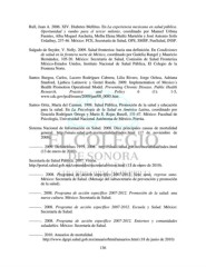 Rull, Juan A. 2006. XIV. Diabetes Mellitus. En La experiencia mexicana en salud pública. Oportunidad y rumbo para el tercer milenio, coordinado por Manuel Urbina Fuentes, Alba Moguel Ancheita, Melba Elena Muñíz Martelón y José Antonio Solís Urdaibay, 237-46. México: FCE, Secretaría de Salud, OPS, SMSP, FunSalud, INSP. Salgado de Snyder, V. Nelly. 2009. Salud fronteriza: hacia una definición. En Condiciones de salud en la frontera norte de México, coordinado por Gudelia Rangel y Mauricio Hernández, 105-20. México: Secretaría de Salud, Comisión de Salud Fronteriza México-Estados Unidos, Instituto Nacional de Salud Pública, El Colegio de la Frontera Norte. Santos Burgoa, Carlos, Lucero Rodríguez Cabrera, Lilia Rivero, Jorge Ochoa, Adriana Stanford, Ljubica Latinovic y Gretel Rueda. 2009. Implementation of Mexico´s Health Promotion Operational Model. Preventing Chronic Disease. Public Health Research, Practice and Policy 6 (1): 1-5, www.cdc.gov/pcd/issues/2009/jan/08_0085.htm . Santos Ortiz, María del Carmen. 1998. Salud Pública. Promoción de la salud y educación para la salud. En La Psicología de la Salud en América Latina, coordinado por Graciela Rodríguez Ortega y Mario E. Rojas Rusell, 131-47. México: Facultad de Psicología, Universidad Nacional Autónoma de México, Porrúa. Sistema Nacional de Información en Salud. 2008. Diez principales causas de mortalidad general. http://sinais.salud.gob.mx/mortalidad/index.html (17 de noviembre de 2008). ----------. 2009. Defunciones 1979, 2008. http://sinais.salud.gob.mx/mortalidad/index.html (13 de enero de 2010). Secretaría de Salud Pública. 2007. Visión. http://portal.salud.gob.mx/contenidos/secretaria/vision.html (13 de enero de 2010). ----------. 2008. Programa de acción específico 2007-2012. Vete sano, regresa sano. México: Secretaría de Salud. (Mensaje del subsecretario de prevención y promoción de la salud). ---------. 2008. Programa de acción específico 2007-2012. Promoción de la salud: una nueva cultura. México: Secretaría de Salud. ---------. 2008. Programa de acción específico 2007-2012. Escuela y Salud. México: Secretaría de Salud. ---------. 2008. Programa de acción específico 2007-2012. Entornos y comunidades saludables. México: Secretaría de Salud. ----------. 2010. Anuarios de mortalidad. http://www.dgepi.salud.gob.mx/anuario/html/anuarios.html (18 de junio de 2010) 136