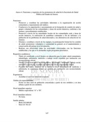 Anexo 4. Funciones y requisitos de los promotores de salud de la Secretaría de Salud Pública del Estado de Sonora Funciones: - Promover y coordinar las actividades inherentes a la organización de acción comunitaria y mejoramiento del médico. - Coadyuvar a la capacitación y asesoramiento en la formación de comités de salud y grupos voluntarios de las comunidades y áreas de acción intensiva, conforme a las normas y procedimientos establecidos. - Promover a través de las autoridades locales de las comunidades sede y áreas de acción intensiva, la realización de asambleas comunales a fin de informar a la población de los problemas de salud detectados y las alternativas de solución de los mismos. - Orientar y coordinar a través de los equipos, la participación formal de los comités de salud, promotores voluntarios y comunidad en general, en el mantenimiento y conservación del primer nivel de atención. - Realizar con efectividad todas las actividades relacionadas con las funciones establecidas y las que se le demanden según programas prioritarios. Requisitos académicos: - Título y/o certificado a nivel técnico en educación para la salud, salud comunitaria, odontología, enfermería, nutrición o trabajo social expedido por institución con reconocimiento oficial. - Título a nivel licenciatura de salud pública, odontología, enfermería, trabajo social, nutrición o psicología, expedido por institución con reconocimiento oficial. - Pasantes del cuarto semestre de la carrera a nivel licenciatura de medicina o enfermería, la constancia deberá ser emitida por institución con reconocimiento oficial. Experiencia: - Acreditar el curso de inducción al puesto. Ámbito de responsabilidad: - Existe en área rural de población concentrada a partir de tres módulos y en área urbana a partir de seis módulos. Nivel inmediato superior: - Médico especialista “A” o “B”. Nivel inmediato inferior: - No tiene. Sueldo tabular: - Bruto $10 060.00 - Neto $ 8 781.63 147