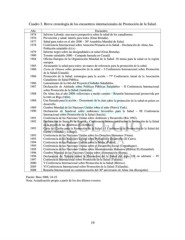 Cuadro 3. Breve cronología de los encuentros internacionales de Promoción de la Salud. Año Encuentro 1974 Informe Lalonde: una nueva perspectiva sobre la salud de los canadienses. 1976 Prevención y salud: interés para todos (Gran Bretaña). 1977 Salud para todos en el año 2000 – 30ª Asamblea Mundial de Salud. 1978 Conferencia Internacional sobre Atención Primaria en la Salud – Declaración de Alma Ata. Población saludable (EUA) 1979 Informe negro sobre las desigualdades en salud (Gran Bretaña). 1980 Toronto saludable 2000 – Campaña lanzada en Canadá. 1984 Oficina Europea de la Organización Mundial de la Salud: 38 metas para la salud en la región europea. 1985 Alcanzando la salud para todos: un marco de referencia para la promoción de la salud. 1986 Carta de Ottawa sobre promoción de la salud – I Conferencia Internacional sobre Promoción de la Salud (Canadá). 1986 Promoción de la Salud: estrategias para la acción – 77ª Conferencia Anual de la Asociación Canadiense de Salud Pública. 1986 Lanzamiento de la OMS del Proyecto Ciudades Saludables. 1987 Declaración de Adelaide sobre Políticas Públicas Saludables – II Conferencia Internacional sobre Promoción de la Salud (Australia). 1988 De Alma Ata al año 2000: reflexiones a medio camino – Reunión Internacional promovida por la OMS en Riga (URSS). 1988 Una llamada para la acción – Documento de la OMS sobre la promoción de la salud en países en desarrollo. 1989 Cumbre Mundial de las Naciones Unidas sobre el niño (Nueva York). 1990 Declaración de Sundsval sobre ambientes favorables para la Salud – III Conferencia Internacional sobre Promoción de la Salud (Suecia). 1991 Conferencia de las Naciones Unidas sobre Ambiente y Desarrollo (Río 1992). 1992 Declaración de Santa Fe de Bogotá – Conferencia Internacional sobre la Promoción de la Salud en la región de las Américas (Colombia). 1992 Carta del Caribe para la Promoción de la Salud – I Conferencia de Promoción de la Salud del Caribe (Trinidad y Tobago). 1993 Conferencia de las Naciones Unidas sobre los Derechos Humanos (Viena). 1993 Conferencia de las Naciones Unidas sobre Población y Desarrollo (El Cairo). 1994 Conferencia de las Naciones Unidas sobre la Mujer (Pekín). 1995 Conferencia de las Naciones Unidas sobre el Desarrollo Social (Copenhague). 1995 Conferencia de las Naciones Unidas sobre Asentamientos Humanos (Hábitat II) (Estambul). 1996 Cumbre Mundial de las Naciones Unidas sobre Alimentación (Roma). 1996 Declaración de Yakarta sobre la Promoción de la Salud del siglo XXI en adelante – IV 1997 Conferencia Internacional sobre Promoción de la Salud (Yakarta). 2000 V Conferencia Internacional sobre Promoción de la Salud (México). 2005 VI Conferencia Internacional sobre Promoción de la Salud (Tailandia). 2008 Reunión Internacional en conmemoración del 30º aniversario de Alma Ata (Kazajstán). Fuente: Buss 2006, 24-25. Nota: Actualización propia a partir de los dos últimos eventos. 19