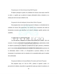 Programa para vivir bien (Arizona Living Well Program) El objetivo principal es ayudar a los ciudadanos de Arizona a tener mejor control de su salud, y a aquellos que ya padecen de alguna enfermedad crónica, orientarlos en su manejo para tener una mejor calidad de vida. Programa de elección inteligente (Arizona Smart Choice Program) Este programa tiene como meta final el prevenir el sobrepeso y la obesidad entre los residentes de Arizona. Éste proporciona a los usuarios de los restaurantes del estado las herramientas necesarias para identificar en el menú de alimentos aquellas opciones más saludables. Programa de artritis (Arthritis Program) Uno de cada seis ciudadanos de Arizona está afectado por la artritis. Ante este escenario, el estado pone en marcha un programa para controlar este padecimiento, donde los objetivos propuestos son: aumentar la conciencia de los signos, síntomas y tratamiento para el autocuidado, aumentar el número y la calidad de los recursos para las personas con la enfermedad, reducir el dolor y la discapacidad en personas artríticas, así como incrementar el conocimiento entre los miembros de la comunidad médica para el combate de la enfermedad. Programa de diabetes de Arizona (Diabetes Prevention and Control Program) Este programa surge en el año de 1994 y plantea lo siguiente: ayudar a la prevención de la diabetes, desarrollar la capacidad del estado para reducir la incidencia y la 36