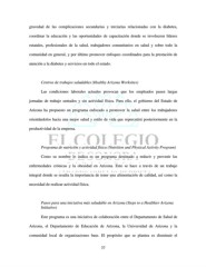 gravedad de las complicaciones secundarias y terciarias relacionadas con la diabetes, coordinar la educación y las oportunidades de capacitación donde se involucren líderes estatales, profesionales de la salud, trabajadores comunitarios en salud y sobre todo la comunidad en general, y por último promover enfoques coordinados para la prestación de atención a la diabetes y servicios en todo el estado. Centros de trabajos saludables (Healthy Arizona Worksites) Las condiciones laborales actuales provocan que los empleados pasen largas jornadas de trabajo sentados y sin actividad física. Para ello, el gobierno del Estado de Arizona ha propuesto un programa enfocado a promover la salud entre los trabajadores orientándolos hacia una mejor salud y estilo de vida que repercutirá posteriormente en la productividad de la empresa. Programa de nutrición y actividad física (Nutrition and Physical Activity Program) Como su nombre lo indica es un programa destinado a reducir y prevenir las enfermedades crónicas y la obesidad en Arizona. Esto se hace a través de un trabajo integral donde se resalta la importancia de tener una alimentación de calidad, así como la necesidad de realizar actividad física. Pasos para una iniciativa más saludable en Arizona (Steps to a Healthier Arizona Initiative) Este programa es una iniciativa de colaboración entre el Departamento de Salud de Arizona, el Departamento de Educación de Arizona, la Universidad de Arizona y la comunidad local de organizaciones base. El propósito que se plantea es disminuir el 37