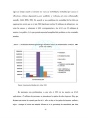lapso de tiempo cuando se elevaron los casos de morbilidad y mortalidad por causas no infecciosas crónicas degenerativas, por accidentes y violencia, así como enfermedades mentales (Solís 2006, 320). De acuerdo a las estadísticas de mortalidad de la OMS esta organización previó que en el año 2005 habría un total de 58 millones de defunciones por todas las causas, y solamente el 60% corresponderían a las ECNT con 35 millones de muertes (ver gráfico 1), lo que permite apreciar la amplitud del problema en las sociedades actuales. Gráfico 1. Mortalidad mundial prevista por distintas causas de enfermedades crónicas, 2005 (todas las edades) 18000000 VIH/SIDA 16000000 TUBERCULOSIS 14000000 12000000 MALARIA 10000000 ENF. CARDIOVASCULARES 8000000 CÁNCER 6000000 ENF. CRÓNICAS 4000000 RESPIRATORIAS DIABETES 2000000 0 DEFUNCIONES 2005 Fuente: Organización Mundial de la Salud 2009. Es alarmante esta problemática ya que sólo el 20% de las muertes de ECNT, equivalente a 7 millones de personas, se presenta en los países de altos ingresos. Hay que destacar que existe la creencia que las ECNT sólo se dan en los países de ingresos medios a bajos, y aunque sí existe una notable diferencia en el porcentaje de mortalidad por estas 42