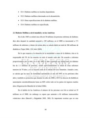 • E11: Diabetes mellitus no insulino-dependiente. • E12: Diabetes mellitus relacionada con la desnutrición. • E13: Otras especificaciones de la diabetes mellitus. • E14: Diabetes mellitus no especificada. 2.1 Diabetes Mellitus a nivel mundial y en las Américas En el año 1985 se estimó una cifra de 30 millones de personas enfermas de diabetes; diez años después la cantidad aumentó a 105 millones; en el 2000 se incrementó a 171 millones de enfermos y dentro de treinta años se calcula habrá un total de 366 millones de diabéticos (Tapia 2004, 139; WHO 2009). En lo que respecta a la situación de la mortalidad a causa de la diabetes, ésta es la responsable del 5% de las muertes en todo el mundo cada año. De acuerdo a informes proporcionados por la OMS, en el año 2005 el dato registrado por defunciones de diabetes fue de 1.1 millones de personas, siendo aproximadamente la mitad de éstas enfermos menores de 70 años y en su mayoría (más de la mitad) del sexo femenino. Aunado a esto, se calcula que las tasas de mortalidad aumentarán en más del 50% en los próximos diez años y también se pronostica que durante los años de 2006 y 2015 los decesos de diabéticos aumentarán considerablemente hasta un 80% sobre todo en los países de ingresos medios altos (Organización Mundial de la Salud 2006). En el ámbito de las Américas el número de las personas con DM se estimó en 35 millones en el 2000, sin embargo se espera que aumente a 64 millones transcurridos veinticinco años (Barceló y Rajpathak 2001, 300). Es importante recalcar que en esta 44