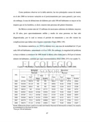 Como podemos observar en la tabla anterior, las tres principales causas de muerte en el año 2008 no tuvieron variación en el posicionamiento por causa general y por sexo; sin embargo, la tasa de defunciones de diabetes por cada 100 mil habitantes es mayor en las mujeres que en los hombres, es decir, mueren más personas del género femenino. En México existen más de 5.5 millones de mexicanos enfermos de diabetes mayores de 20 años, pero aproximadamente millón y medio de estas personas no han sido diagnosticadas, por lo cual se retrasa el período de tratamiento y con ello vienen las complicaciones que dañan otros órganos corporales (Tapia 2004, 139). En términos numéricos, en 1922 la diabetes tuvo una tasa de mortalidad de 2.5 por cada 100 mil habitantes, aumentando a 4.8 en 1950. Sin embargo, la magnitud del problema se hace evidente a comienzos de 1990 donde la última cifra citada pasó a 30.8 por el mismo número de habitantes, cantidad que sigue incrementándose (Rull 2006, 237) (ver cuadro 7). Cuadro 7. Morbilidad y mortalidad por diabetes mellitus en México, 2000-2008. Morbilidad Mortalidad Nacional Nacional Año Sexo Sexo Casos Tasa* Casos Tasa* Mujer Hombre Mujer Hombre 2000 287180 288.38 ND ND 46614 46.8 25750 20864 2001 294198 291.29 ND ND 49954 49.46 27588 22366 2002 315948 308.61 ND ND 54925 53.64 29727 25208 2003 380332 365 233161 147171 59192 56.8 32401 26791 2004 404562 384.02 247646 156916 62243 59.08 33848 28395 2005 397387 373.3 244766 152621 67159 63.08 36280 30879 2006 394360 366.76 241524 152836 68421 63.43 36511 31910 2007 404770 372.8 244702 160068 70517 65.45 37204 33313 2008 396374 371.54 237382 158992 75637 70.89 39940 33697 Fuente: Elaboración propia a partir de los datos del Sistema Nacional de Información en Salud y los anuarios de morbilidad de la Secretaría de Salud. *Tasa por 100 mil habitantes. 47