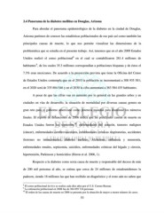 2.4 Panorama de la diabetes mellitus en Douglas, Arizona Para abordar el panorama epidemiológico de la diabetes en la ciudad de Douglas, Arizona partimos de conocer las estadísticas poblacionales de ese país así como también las principales causas de muerte, lo que nos permite visualizar las dimensiones de la problemática que se estudia en el presente trabajo. Así, tenemos que en el año 2000 Estados 8 Unidos realizó el censo poblacional en el cual se contabilizaron 281.4 millones de 9 habitantes , de los cuales 35.3 millones correspondían a poblaciones hispanas y de éstos el 7.3% eran mexicanos. De acuerdo a la proyección prevista que tiene la Oficina del Censo de Estados Unidos contempla que en el 2010 la población se incrementará a 308 935 581; en el 2020 será de 335 804 546 y en el 2030 la cifra aumentará a 363 584 435 habitantes. A pesar de que las cifras van en aumento por lo general en las grandes urbes y en ciudades en vías de desarrollo, la situación de mortalidad por diversas causas genera un gran reto para el gobierno americano como potencia mundial para disminuir los números finales. El reporte de defunciones de 2006 indica que las principales causas de muerte en 10 Estados Unidos fueron las siguientes : enfermedades del corazón, tumores malignos (cáncer), enfermedades cerebrovasculares, enfermedades crónicas respiratorias, accidentes (lesiones no intencionales), diabetes mellitus, Alzheimer, influenza y neumonía, enfermedades renales, septicemia, suicidios, enfermedades crónicas del hígado y cirrosis, hipertensión, Parkinson y homicidios (Heron et al. 2006, 1). Respecto a la diabetes como sexta causa de muerte y responsable del deceso de más de 200 mil personas al año, se estima que cerca de 24 millones de estadounidenses la padecen, siendo 18 millones las que han recibido un diagnóstico y el resto aún no saben que 8 El censo poblacional de EUA se realiza cada diez años por el U.S. Census Bureau. 9 La estimación poblacional en 2008 fue de 304 059 724 personas. 10 El orden de las causas de muerte en 2006 se presenta por la situación de mayor a menor número de casos. 53