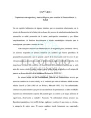 CAPÍTULO 3 Propuestas conceptuales y metodológicas para estudiar la Promoción de la Salud En este capítulo hablaremos de algunos términos que se encuentran relacionados con la práctica de Promoción de la Salud, tal es el caso del proceso de salud/enfermedad/atención, prevención en salud, promoción de la salud, participación comunitaria y por último empoderamiento. Al finalizar describiremos el diseño metodológico adoptado para la investigación, que atañe a estudios de caso. Ante cualquier situación de enfermedad (sea de magnitud grave, moderada o leve), las personas responden en primera instancia con cuidados que fueron aprendidos de generación en generación y por lo general a través de la observación o de viva voz. Es por esto que cuando se presenta un cuadro de enfermedad de algún miembro de la familia, en la mayoría de los casos éste conlleva a la modificación de la dinámica familiar que se tenía antes del suceso, siendo la mujer (madre, esposa o hija) la que se adjudica o se le asigna (de manera no democrática) el rol de cuidadora (Robles et al. 1993, 89). Lo mismo ocurre en las Enfermedades Crónicas no Transmisibles (ECNT) que provocan cambios en el sector salud y en la sociedad que rodea al enfermo, debido a como señalan Leavell y Clark (1965 cit. en Robles y Mercado 1993, 311) “las enfermedades crónicas son padecimientos que por sus características de permanencia y daños residuales requieren de entrenamiento especial del paciente para su control y de largos períodos de supervisión, observación y cuidado”. Asimismo “la enfermedad crónica produce una dependencia paulatina e irreversible de tipo orgánica y social por lo que nunca se retorna a la categoría de sujeto sano. El cuerpo orgánico pierde lentamente sus capacidades 59