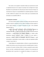 Para concluir con este apartado es importante señalar que la promoción de la salud es complemento del proceso s/e/a. Aunque en un principio estuvo restringido sólo al campo del quehacer de los profesionales de la educación para la salud, al transcurrir el tiempo y las circunstancias de vida pasó a ser responsabilidad de la comunidad organizada con intereses en salud y también de los agentes de otros sectores sociales que no necesariamente están involucrados con la salud (Buss 2006, 43). 3.4 Participación comunitaria En los años cuarenta comienza a utilizarse este término, mismo que tenía la tarea de contribuir a mejorar las condiciones de vida y reducir la incidencia de factores negativos a nivel de grupos domésticos y de grupos de autoayuda así como a nivel comunitario (Menéndez 2006, 51). Durante la Conferencia de Alma-Ata en 1978 se estableció una definición de comunidad como sigue: “se compone de personas que viven juntas, en una u otra forma de organización y cohesión sociales, sus miembros comparten, en distintos grados, características políticas, económicas, sociales y culturales, así como intereses y aspiraciones, incluida la salud. Las comunidades varían en su magnitud y papel socioeconómico y puede habitar en caseríos aislados o en aldeas más organizadas, pueblos o ciudades” (Castro 1996, 27). Cuando hablamos de comunidad tendemos a referirnos a un grupo determinado que comparte ciertos intereses, que nos hace pensar que toda la comunidad requiere lo mismo, y no sucede así. De acuerdo a de Keijzer (2004, 4) el término comunidad ha tomado sentidos diversos y, por ende, va perdiendo poder descriptivo o explicativo. Es un concepto que nos precondiciona sobre lo que debe ser la comunidad. Sin embargo, en la mayoría de las 70