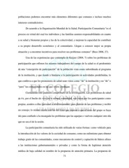 poblaciones podemos encontrar más elementos diferentes que comunes e incluso muchos intereses contradictorios. De acuerdo a la Organización Mundial de la Salud, Participación Comunitaria “es el proceso en virtud del cual los individuos y las familias asumen responsabilidades en cuanto a su salud y bienestar propios y las de la colectividad, y mejoran la capacidad de contribuir a su propio desarrollo económico y al comunitario. Llegan a conocer mejor su propia situación y a encontrar incentivos para resolver sus problemas comunes” (Buss 2006, 27). Una de las experiencias que contempla de Keijzer (2004, 7) sobre los problemas de participación que refieren los mismos trabajadores del campo de la salud es el predominio de una “concepción de participación” de la población vista como subordinada al programa de la institución, y que tiende a limitarse a la participación en actividades predefinidas, lo que conlleva a que los promotores de salud sean vistos como “de” la institución y no “de” o “para” las comunidades en las que viven y trabajan. Ciertamente esto pudimos comprobarlo en la investigación. Las promotoras de salud de PA, por el hecho de vivir en la misma comunidad, son vistas por los participantes como propias, acuden a ellas (personal o telefónicamente) para platicar de sus problemas y recibir un consejo; lo mismo ocurre con las del GAM que esperan a que el resto del grupo se haya ido para confiarle a la encargada los problemas que las aquejan o vuelven cualquier otro día que no sea el de la sesión. La participación comunitaria ha sido utilizada de varias formas: como vehículo para la introducción de los valores de la sociedad de consumo, como un eufemismo para obtener trabajo gratis de las comunidades, como mecanismo de control y captación de líderes afines a las instituciones gubernamentales o privadas y como la forma de legitimar atención médica de baja calidad en nombre de la propuesta de atención primaria. La propuesta de 71