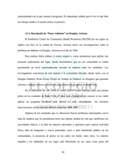 particularidad con la que cuenta el programa. Es importante señalar que PA no se rige bajo un enfoque médico ni mucho menos su práctica. 4.1.1 Descripción de “Pasos Adelante” en Douglas, Arizona El Southwest Center for Community Health Promotion (SCCHP por sus siglas en inglés) con base en la ciudad de Tucson, Arizona inició sus investigaciones sobre el problema de diabetes en Douglas, Arizona en el año de 1996. Para realizar dicho trabajo el centro empleó a varias promotoras para aplicar una encuesta exploratoria del lugar, donde descubrieron que en esa comunidad se estaba presentando un nivel extremadamente elevado de diabetes entre los residentes. Los investigadores conocieron de esta manera a la comunidad afectada, dando inicio con el Douglas Diabetes Work Group (Grupo de Trabajo de Diabetes en Douglas) que permitió solicitar y obtener recursos económicos para realizar un programa de salud rural. En el transcurso del año 2000 el Centro utilizó fondos federales para una prueba piloto en los condados de Santa Cruz y Yuma, con el propósito de conocer si era viable aplicar un programa diseñado para latinos en estas comunidades. Así iniciaron intervenciones con las familias durante el período 2000-2003. Algunos de los resultados que se obtuvieron fueron problemas relacionados con la falta de empleos que les permitieran tener una óptima calidad de vida que satisficiera sus necesidades básicas, a la falta de espacios adecuados y oportunos para realizar actividad física, falta de banquetas o cruces peatonales, poco o nulo alumbrado público en las comunidades, la presencia de perros en las calles sin dueño, entre otros. Lo anterior impedía a los habitantes de ese lugar salir libremente de sus casas como parte del 82