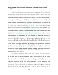 4.2 Secretaría de Salud: Programas de promoción de la salud y grupos de ayuda mutua La Secretaría de Salud como institución rectora encargada de velar por la salud de los mexicanos, tiene la máxima tarea de crear, proponer, trabajar y llevar a cabo en la comunidad programas enfocados a la promoción de la salud y prevención de enfermedades. Algunos de los programas de salud que a nivel federal se han implementado en el Estado de Sonora debieron modificarse debido a las particularidades de los municipios de la entidad. Estos programas (modificados) se dan en el marco del programa integral llamado “Sonora por la vida” que fue elaborado para el quinquenio 2004-2009. Éste tiene como objetivo general “fomentar la corresponsabilidad, donde exista la equidad social, para generar acceso equitativo a una calidad de vida con una prestación de servicio y empoderamiento de determinantes en salud mediante la promoción, educación y prevención” (Secretaría de Salud s.f, 11). Asimismo se plantea como reto de salud “enfrentar, entre tantas prioridades, los rezagos de marginación, exclusión y discriminación. No se pueden obviar estas situaciones que conllevan a la generación de verdaderos problemas de salud pública como la mortalidad materna, embarazo adolescente, malnutrición, diabetes mellitus, zoonosis, ambientes insalubres, tuberculosis, adicciones y apatía social entre otros” (Ibid., 8). Los programas descritos en “Sonora por la vida” se enlistan como sigue: Caravana de la Salud, Red de Servicios Esenciales para la Salud (REDSES), Red de Enlace Comunitario, Casa Saludable, Desarrollo Humano de Oportunidades, Extensión de la Cobertura, Habilidades para la Vida, Familias Saludables, Casas de Hidratación Oral (CADHISON), Casas de Detección de Infecciones Respiratorias Agudas (CADIRAS), Detección de Cáncer de la Mujer, Bienvenida a todos los Nuevos Sonorenses, En mi 85