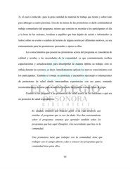 2), el cual es reducido para la gran cantidad de material de trabajo que tienen y sobre todo para albergar a cuatro personas. Una de las tareas de las promotoras es darle continuidad al trabajo comunitario del programa, mismo que consiste en recordar a los participantes el día y la hora de las sesiones, localizar a aquéllos que han dejado de asistir e informarles (a todos) sobre un evento o cambio de horario de alguna sesión por diferentes motivos, ya sea entrenamiento para las promotoras, personales o ajenos a ellas. Los conocimientos que poseen las promotoras acerca del programa se consideran de calidad y acordes a las necesidades de la comunidad, ya que constantemente reciben capacitaciones y actualizaciones para desempeñar de manera óptima su trabajo; esto se refleja durante las sesiones, es decir, inmediatamente aplican los nuevos conocimientos con los participantes. También es común su asistencia a encuentros nacionales e internaciones de promotoras de salud donde intercambian experiencias con sus pares, tomando recomendaciones de otras para desarrollar con más facilidad su trabajo frente al grupo. Cuando se les preguntó a las promotoras de salud acerca de las funciones o qué era un promotor de salud respondieron: Es ayudar, tenemos que buscar gente a la cual tenemos que enseñar el programa que se nos ha dado. Nos dan entrenamiento sobre el programa; tenemos que aprender también todos los programas que hay aquí (Douglas) y las necesidades que hay en la comunidad. Una promotora tiene que trabajar con la comunidad, tiene que trabajar con el campo abierto y dar a conocer los programas que la comunidad tiene para ellos. 93
