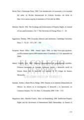David, Paul y Dominique Foray. 2002. Una introducción a la economía y a la sociedad del saber, en Revista Internacional de Ciencias Sociales, sin fecha en http://www.unesco.org/issj (Consultado el 29 de abril de 2008). Demsetz, Harold. 1964. The Exchange and Enforcement of Property Rights, en Journal of Law and Economics, Vol. 7. The University of Chicago Press: 11 – 26. Eggertsson, Thráinn. 1990. Economic behavior and institutions. Cambridge University Press: 3 – 79, 83 – 153 y 247 – 358. European Patent Office. 2008. Annual report 2008, en http://www.epo.org/about- us/office/annual-reports/2008/statistics.html (Consultado el 12 de septiembre de 2009). Gámez Corrales, José. 2009. Patentes: Aseguramiento del conocimiento científico. Ponencia presentada en Jornadas Gobiernos locales y desarrollo social en Sonora: Retos para el desarrollo con equidad, de El Colegio de Sonora, Hermosillo. Guzmán, Alenka y María Pluvia Zúñiga. 2004. Patentes en la industria farmacéutica de México: los efectos en la investigación, el desarrollo y la innovación, en Comercio Exterior, Vol. 54, Núm. 12, Diciembre 2004: 1104 – 1121. Hagedoorn, John, Danielle Cloodt y Hans van Kranenburg. 2005. Intellectual Property Rights and the Governance of International R&D Partnerships, en Journal of 113