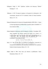 Schumpeter, Joseph A. 1942. Capitalism, socialism and democracy. Editorial Routledge: 61 – 130. Silberston, A. 1967. El sistema de patentes, en Economía de la información y del conocimiento, selección de D. M. Lamberton. Fondo de Cultura Económica. México: 219 – 232. Sistema de Información de la Gaceta de la Propiedad Industrial. 2009. SIGA e – Gaceta en http://siga.impi.gob.mx/wb/SIGA/SIGA_busqueda_simple (Consultado el 6 de noviembre de 2009). Sistema Integrado de Información sobre Investigación Científica y Tecnológica. 2007. Anexo Estadístico Del Informe General Del Estado de la Ciencia y la Tecnología 2007, http://www.siicyt.gob.mx/siicyt/cms/paginas/IndCientifTec.jsp (Consultado el 10 de octubre de 2009). Slitor, R. E. 1966. El trato fiscal y la inversión en investigación e innovación, en Economía de la información y del conocimiento, selección de D. M. Lamberton. Fondo de Cultura Económica. México: 219 – 232. Stiglitz, Joseph E. 2006. Cómo hacer que funcione la globalización. Taurus Pensamiento. México: 143 – 177. 116