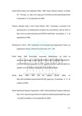 United States Patent and Trademark Office. 2008. Patent Statistics Reports Available For Viewing, en http://www.uspto.gov/web/offices/ac/ido/oeip/taf/reports.htm (Consultado el 11 de septiembre de 2009). Vilaseca, Requena Jordi y Joan Torrent Sellens. 2001. Tecnología y economía: Una aproximación a la interpretación económica del conocimiento, abril de 2001 en http://www.uoc.edu/web/esp/art/one/0104013/one04.html (Consultado el 2 de septiembre de 2009). Williamson E. Oliver. 1995. Transaction Cost Economics and Organization Theory, en Organization Theory. Oxford University Press: 207 – 256. World Bank. 2008. Knowledge Assessment Methodology, sin fecha en http://web.worldbank.org/WBSITE/EXTERNAL/WBI/WBIPROGRAMS/KFD LP/EXTUNIKAM/0,,menuPK:1414738~pagePK:64168427~piPK:64168435~th eSitePK:1414721,00.html (Consultado el 30 de abril de 2008). World Bank. 2009. KEI and KI Indexes (KAM 2009), en http://info.worldbank.org/etools/kam2/KAM_page5.asp (Consultado el 15 de octubre de 2009). World Intellectual Property Organization. 2009. World Intellectual Property Indicators, http://www.wipo.int/export/sites/www/ipstats/en/statistics/patents/pdf/wipo_pub _941.pdf (Consultado el 10 de septiembre de 2009). 117