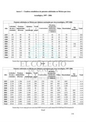Anexo 1 – Cuadros estadísticos de patentes solicitadas en México por área tecnológica, 1997 - 2006 Patentes solicitadas en México por titulares nacionales por área tecnológica, 1997-2006 Mecánica, Artículos Técnicas Química Textil iluminación Sin Año de uso y industriales y y Construcciones calefacción, Física Electricidad clasificar Total consumo diversas metalurgia papel armamento y voladuras 1997 88 84 70 6 51 42 45 34 420 1998 119 99 87 9 51 30 32 26 453 1999 103 86 69 8 46 64 41 38 455 2000 93 60 76 6 33 53 30 80 431 2001 43 35 61 4 22 14 17 2 336 534 2002 127 70 55 1 50 33 45 18 127 526 2003 115 107 84 9 39 40 39 35 468 2004 163 136 79 6 35 46 51 49 565 2005 192 148 80 5 28 56 44 31 584 2006 188 146 77 4 30 58 42 29 574 Total 1231 971 738 58 385 436 386 342 463 5010 Fuente:http://www.impi.gob.mx/work/sites/IMPI/resources/LocalContent/820/4/IMPIenCIFRASenedic20 08.pdf Patentes solicitadas en México por titulares extranjeros por área tecnológica, 1997-2006 Mecánica, Artículos Técnicas Química Textil iluminación Sin Año de uso y industriales y y Construcciones calefacción, Física Electricidad clasificar Total consumo diversas metalurgia papel armamento y voladuras 1997 2,228 1,796 3,147 250 270 576 747 1097 10,111 1998 2,124 1,789 3,132 286 219 687 863 1,340 10,440 1999 2,520 2,001 3,629 288 309 655 851 1,402 11,655 2000 6,726 2,384 1,032 90 225 389 1,158 626 12,630 2001 6,402 2,506 1,106 67 233 432 868 523 895 13,032 2002 2,999 1,884 3,540 264 304 648 1,059 1,072 766 12,536 2003 3571 2114 2699 219 267 612 936 1082 239 11,739 2004 3,840 2,275 2,904 236 288 659 1,007 1,164 256 12,629 2005 4,212 2,495 3,185 259 316 723 1,105 1,276 281 13,852 2006 4,539 2,688 3,432 279 341 779 1,191 1,375 303 14,926 Total 39161 21932 27806 2238 2772 6160 9785 10957 2740 123550 Fuente:http://www.impi.gob.mx/work/sites/IMPI/resources/LocalContent/820/4/IMPIenCIFRASenedic20 08.pdf 118