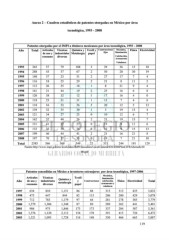 Anexo 2 – Cuadros estadísticos de patentes otorgadas en México por área tecnológica, 1993 - 2008 Patentes otorgadas por el IMPI a titulares mexicanos por área tecnológica, 1993 - 2008 Año Total Artículos Técnicas Química y Textil y Construcciones Mecánica, Física Electricidad de uso y industriales Metalurgia papel fijas Iluminación consumo diversas Calefacción, Armamento Voladuras 1993 343 57 79 108 3 29 36 13 18 1994 288 43 57 67 2 50 20 30 19 1995 148 37 23 31 2 27 17 7 4 1996 116 18 25 29 2 21 8 11 2 1997 112 26 25 18 1 8 21 9 4 1998 141 21 44 19 2 25 16 6 8 1999 120 38 32 12 1 17 16 4 0 2000 118 23 31 31 1 15 7 4 6 2001 118 16 23 26 3 20 12 5 13 2002 139 32 35 30 1 5 19 13 4 2003 121 34 27 25 0 10 12 6 7 2004 162 32 40 26 2 21 19 15 7 2005 131 41 22 27 0 15 9 11 6 2006 132 32 25 26 0 12 9 15 13 2007 199 46 44 41 2 21 16 21 8 2008 197 70 37 33 0 19 7 21 10 Total 2585 566 569 549 22 315 244 191 129 Fuente:http://www.impi.gob.mx/work/sites/IMPI/resources/LocalContent/820/4/IMPIenCIFRASenedic20 08.pdf Patentes concedidas en México a inventores extranjeros por área tecnológica, 1997-2006 Mecánica, Artículos Técnicas Textil iluminación Química y Año de uso y industriales metalurgia y Construcciones calefacción, Física Electricidad Total consumo diversas papel armamento y voladuras 1997 634 810 1,151 86 88 315 313 435 3,832 1998 475 647 844 82 115 206 280 429 3,078 1999 712 783 1,179 97 64 281 278 385 3,779 2000 1,579 1,306 1,348 87 89 289 262 441 5,401 2001 986 975 1,846 173 173 337 284 587 5,361 2002 1,376 1,120 2,112 154 178 391 415 726 6,472 2003 1,321 1,093 1,728 116 148 350 466 665 5,887 119