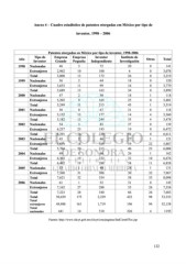 Anexo 4 – Cuadro estadístico de patentes otorgadas em México por tipo de inventor, 1998 – 2006 Patentes otorgadas en México por tipo de inventor, 1998-2006 Tipo de Empresa Empresa Inventor Instituto de Año Otros Total Inventor Grande Pequeña Independiente Investigación 1998 Nacionales 46 3 72 20 0 141 Extranjeros 2,962 10 100 6 0 3,078 Total 3,008 13 172 26 0 3,219 1999 Nacionales 36 2 64 18 0 120 Extranjeros 3,653 11 99 16 0 3,779 Total 3,689 13 163 34 0 3,899 2000 Nacionales 47 2 50 18 1 118 Extranjeros 5,202 9 165 25 0 5,401 Total 5,249 11 215 43 1 5,519 2001 Nacionales 30 0 67 21 0 118 Extranjeros 5,152 13 177 14 4 5,360 Total 5,182 13 244 35 4 5,478 2002 Nacionales 54 3 45 37 0 139 Extranjeros 6,237 23 193 19 0 6,472 Total 6,291 26 238 56 0 6,611 2003 Nacionales 45 2 46 27 1 121 Extranjeros 5,659 18 169 19 22 5,887 Total 5,704 20 215 46 23 6,008 2004 Nacionales 69 0 66 26 1 162 Extranjeros 6,393 19 222 32 10 6,676 Total 6,462 19 288 58 11 6,838 2005 Nacionales 53 1 48 28 1 131 Extranjeros 7,568 31 306 30 32 7,967 Total 7,621 32 354 58 33 8,098 2006 Nacionales 61 1 52 31 0 145 Extranjeros 7,162 27 288 35 26 7,538 Total 7,223 28 340 66 26 7,683 Total 50,429 175 2,229 422 98 53,353 Total extranjeros 49,988 161 1,719 196 94 52,158 Total nacionales 441 14 510 226 4 1195 Fuente: http://www.siicyt.gob.mx/siicyt/cms/paginas/IndCientifTec.jsp 122