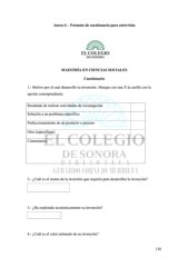 Anexo 6 – Formato de cuestionario para entrevista MAESTRÍA EN CIENCIAS SOCIALES Cuestionario 1.- Motivo por el cual desarrolló su invención. Marque con una X la casilla con la opción correspondiente. Resultado de realizar actividades de investigación Solución a un problema específico Perfeccionamiento de un producto o proceso Otro (especifique) Comentarios 2.- ¿Cuál es el monto de la inversión que requirió para desarrollar la invención? 3.- ¿Ha explotado económicamente su invención? 4.- ¿Cuál es el valor estimado de su invención? 130