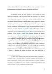 celebrar contratos sobre él con otros individuos. Tercero, existe el derecho de transferir 1 permanentemente a otra persona los derechos de propiedad sobre el bien . Es importante precisar que estos derechos no son ilimitados y existen restricciones establecidas en las disposiciones legales para garantizar un uso adecuado de los recursos que no perturbe el orden social. Incluso, existe la posibilidad de que otras personas posean una porción de derechos sobre un bien o recurso cuyos derechos de propiedad pertenecen a otra persona. Por ejemplo, aún cuando una persona posea derechos de propiedad sobre una porción de tierra, otras personas pueden reclamar un derecho de paso sobre ese terreno para transitar a través de él, siempre y cuando no transgreda los derechos del propietario del terreno. Siguiendo el mismo ejemplo, puede presentarse el caso de que el Estado, como propietario primigenio del territorio demarcado dentro de los límites que fija el derecho internacional, separe al propietario de sus derechos de propiedad sobre un terreno por causas de utilidad pública, otorgándole una compensación económica por esta separación. El Estado también puede reclamar el pago de impuestos sobre la propiedad de un terreno, u obligar al propietario a trabajar la tierra para que su propiedad no sea ociosa. El hecho de que diferentes personas o entes como el Estado posean diferentes porciones de derechos sobre un bien o recurso y la obligación de respetar los derechos sobre bienes ajenos para la 1 Al respecto, Oliver Williamson (1995) propone tres elementos similares de los derechos de propiedad: El derecho de usar el activo, el derecho de apropiarse los beneficios derivados del activo y el derecho a cambiar la forma y sustancia del activo. Distingue del derecho de uso el derecho de cambiar la forma del bien o activo, a diferencia de la primera concepción de los derechos de propiedad, en la cual el derecho de uso incluye la facultad de transformar la forma física del bien. 16