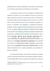 industrializados que se encuentran desarrollando en mayor grado una economía basada en el conocimiento, destinan grandes recursos financieros a estas actividades. La tecnología que se genera a través de la investigación es transmisible, puede transferirse de una persona a otra. Esta característica la convierte en un bien que es objeto de transacciones comerciales en el mercado (Álvarez 1979, 32). El hecho de que la tecnología constituya una mercancía significa que tiene un valor de uso y un valor de cambio, es decir, representa para quien la posee, la posibilidad de explotarla en su provecho o de transmitirla a otros consumidores. La transferencia de tecnología es actualmente una fuente de ingresos crecientes para las empresas que la producen (Ibíd. 34). Como ha señalado la Organización Mundial de la Propiedad Intelectual (OMPI), cuanto más moderna sea la tecnología y más elevado sea el grado de especialización del procedimiento y del producto, tanto más probable es que esa tecnología esté sujeta a derechos de propiedad industrial y que esa información técnica, calificaciones o experiencia profesional, esté controlada en forma exclusiva por un particular o una 8 empresa que a menudo opera en muchos países . Ya se ha mencionado con anterioridad que las patentes son el medio legal para asegurar la tecnología y obtener derechos exclusivos sobre su explotación. Por esta razón, las patentes constituyen un factor central del funcionamiento de la economía contemporánea, cuyas características se describen a continuación. La economía del conocimiento o nueva economía es aquella que crea, disemina y utiliza el conocimiento de manera efectiva para incrementar el desarrollo económico y social (World Bank 2006). Se basa en la creación de valor mediante el uso intensivo del 8 Organización Mundial de la Propiedad Intelectual, Guía de licencias para países en desarrollo, Publicación OMPI, No. 625, Suiza, 1977: 25. 27