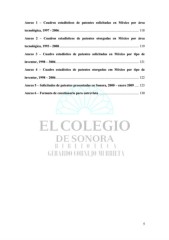 Anexo 1 – Cuadros estadísticos de patentes solicitadas en México por área tecnológica, 1997 - 2006 .............................................................................................. 118 Anexo 2 – Cuadros estadísticos de patentes otorgadas en México por área tecnológica, 1993 - 2008 .............................................................................................. 119 Anexo 3 – Cuadro estadístico de patentes solicitadas en México por tipo de inventor, 1998 – 3006 .................................................................................................. 121 Anexo 4 – Cuadro estadístico de patentes otorgadas em México por tipo de inventor, 1998 – 2006 .................................................................................................. 122 Anexo 5 – Solicitudes de patentes presentadas en Sonora, 2000 – enero 2009 ..... 123 Anexo 6 – Formato de cuestionario para entrevista ................................................ 130 5