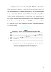 Al igual que ocurre en el resto del mundo, desde 1995 hasta el año pasado ha habido una tendencia al aumento en el número de solicitudes en Estados Unidos. En el 2008, se presentaron 485,312. Tomando como referencia el 2007, que es el último año en que se tiene registro del total de patentes solicitadas en el mundo, se ve que de las 1,854,416 millones de solicitudes, 484, 955 fueron hechas en los Estados Unidos, es decir, el 26 % del total de solicitudes presentadas en el mundo corresponden a Estados Unidos. De acuerdo con los Cuadros 2 y 3, de las 764,700 patentes que se concedieron en el mismo año, 182,928 fueron otorgadas en los Estados Unidos, aproximadamente. 24 % del total mundial. Gráfica 3 Solicitudes de patentes presentadas ante USPTO, 1995 - 2008 600,000 500,000 400,000 Patentes 300,000 200,000 100,000 0 1995 1996 1997 1998 1999 2000 2001 2002 2003 2004 2005 2006 2007 2008 Fuente: http://www.uspto.gov/web/offices/ac/ido/oeip/taf/reports.htm 54