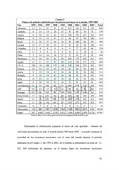 Cuadro 3 Número de patentes solicitadas por inventores mexicanos en el mundo, 1995-2003 País 1995 1996 1997 1998 1999 2000 2001 2002 2003 Total Alemania 13 31 47 87 62 107 181 171 170 869 Australia 6 14 19 28 25 47 88 78 74 379 Austria 11 26 43 84 58 104 176 167 163 832 Bélgica 8 19 34 67 37 60 93 94 100 512 Brasil 11 16 27 65 34 52 106 96 99 506 Canadá 18 27 40 65 43 62 96 94 108 553 Colombia 12 4 0 9 6 9 77 63 44 224 Chile 11 5 0 0 8 15 0 14 13 66 China 5 14 24 36 27 57 93 87 83 426 Dinamarca 12 24 42 83 58 102 175 165 161 822 España 13 31 47 87 60 110 190 177 174 889 E.U.A 106 114 140 179 163 228 264 274 365 1833 Francia 10 25 35 67 38 61 93 95 103 527 Grecia 9 19 34 67 36 60 93 93 100 511 Holanda 9 19 34 67 36 60 93 95 101 514 Italia 10 24 35 67 38 60 93 93 102 522 Japón 8 20 28 53 34 53 91 87 91 465 Luxemburgo 11 24 42 82 55 102 175 165 160 816 OEP 10 24 35 67 36 60 93 92 102 519 Portugal 12 26 43 85 59 103 175 166 163 832 Reino Unido 17 33 46 85 60 105 183 169 170 868 Suecia 12 25 43 84 57 103 174 165 161 824 Suiza 11 26 41 84 57 107 175 167 163 831 Venezuela 0 7 0 0 0 13 0 0 5 25 Otros países 222 445 783 1,530 1564 3549 7022 6072 5149 26336 Total 567 1,042 1,662 3,128 2,651 5,389 9,999 8,939 8,124 41501 Fuente: http://www.siicyt.gob.mx/siicyt/cms/paginas/IndCientifTec.jsp Retomando la información expuesta al inicio de este apartado – número de solicitudes presentadas en todo el mundo desde 1985 hasta 2007 – se puede comparar la actividad de los inventores mexicanos con el resto del mundo durante el período analizado en el Cuadro 3. De 1995 a 2003, en el mundo se presentaron un total de 11, 563, 366 solicitudes de patentes; en el mismo lapso los inventores mexicanos 62