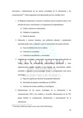 innovación e infraestructura de las nuevas tecnologías de la información y las 25 comunicaciones . Cada componente está representado por tres variables clave: 1. El Régimen institucional e incentivo económico provee incentivos para el uso eficiente de nuevo conocimiento y el surgimiento de emprendedores. a) Tarifas y barreras no arancelarias. b) Calidad en la regulación. c) Estado de derecho. 2. Educación y recursos humanos, una población educada y propiamente entrenada puede crear, compartir y usar el conocimiento de manera eficiente. a) Tasa de alfabetización de los adultos. b) Cobertura en secundaria. c) Cobertura en bachillerato y universidad. 3. Adopción de tecnología e innovación, un sistema de innovación eficiente de firmas, centros de investigación, universidades, consultorías y otras organizaciones, pueden acceder a las reservas de conocimiento global, asimilarlo y adaptarlo a las necesidades locales y eventualmente crear nueva tecnología. a) Pagos de regalías por derechos de propiedad intelectual. b) Solicitudes de patentes concedidas por la USPTO. c) Artículos de revistas científicas y tecnológicas. 4. Infraestructura de las nuevas tecnologías de la información y las comunicaciones (TIC), una moderna y accesible infraestructura de las TIC puede facilitar la comunicación, diseminación y procesamiento de la información. 25 World Bank (2008) Knowledge Economy Index (KEI) 2008 Rankings. 65