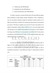 a) Teléfonos por cada 1000 habitantes. b) Computadora por cada 1000 habitantes. c) Usuarios de Internet por cada 10,000 habitantes. El Cuadro 4 muestra la evolución del KEI desde 1995 hasta 2008 para algunos países clasificados en cuatro regiones: Europa, Norteamérica, Centro y Sudamérica y Asia. En este período, Dinamarca siempre ha mantenido la primera posición. En el 2008, esta nación obtuvo un KEI de 9.58, mientras que Suecia pasó de la sexta posición que ocupó en 1995 hasta la segunda con un nivel de 9.52 para el año pasado. En la región de Norteamérica, México obtuvo un KEI de 5.45 y cayó cuatro lugares desde 1995, del lugar 55 al 59. Estados Unidos también tuvo un retroceso, en 1995 ocupaba el tercer lugar y para 2008 cayó a la novena posición con un KEI de 9.08. El único país de esta región que escaló posiciones fue Canadá: en 1995 ocupaba el décimo lugar y para 2008 alcanzó el sexto con un KEI de 9.21. El avance más importante en la tabla del KEI mundial lo dio Brasil al subir 10 lugares, en 1995 ocupaba la posición 64 y en el 2008 se ubicó en el lugar 54 con un nivel de 5.57. El mayor retroceso fue de Panamá quien bajó 21 lugares, en 1995 se encontraba en la posición 51 y para 2008 cayó al lugar 72, cuando alcanzó un KEI de 4.69. Cuadro 4 Posición 2008 según el KEI Posición KEI Posición Cambio desde Región País 2008 2008 1995 1995 Europa Dinamarca 1 9.58 1 0 Suecia 2 9.52 6 4 Finlandia 3 9.37 2 -1 Holanda 4 9.32 4 0 Noruega 5 9.27 5 0 66