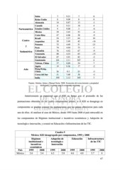 Suiza 7 9.21 7 0 Reino Unido 8 9.09 8 0 Alemania 14 8.87 13 -1 Canadá 6 9.21 10 4 Norteamérica Estados Unidos 9 9.08 3 -6 México 59 5.45 55 -4 Costa Rica 47 6.06 38 -9 Brasil 54 5.57 64 10 Centro Argentina 58 5.49 42 -16 y Panama 72 4.69 51 -21 Perú 74 4.64 73 -1 Sudamérica Colombia 76 4.42 67 -9 Venezuela 80 4.23 65 -15 El Salvador 87 3.91 85 -2 Guatemala 101 3.11 107 6 Taiwan, China 17 8.69 24 7 Japón 19 8.56 17 -2 Asia Hong Kong, China 26 8.2 23 -3 Corea del Sur 31 7.68 28 -3 India 100 3.12 105 5 Fuente: Aboites, Jaime y Manuel Soria. 2008. Economía del conocimiento y propiedad intelectual: Lecciones para la economía mexicana Anteriormente se mencionó que el KEI se forma con el promedio de las puntuaciones obtenidas en los cuatro componentes pilares; si el KEI se desagrega en componentes se pueden conocer las puntuaciones que los países obtuvieron para cada uno de ellos. Al analizar el caso de México, desde 1995 hasta 2008 el país retrocedió en los componentes de Régimen institucional e incentivos económicos y Adopción de tecnología e innovación, y avanzó en Educación e Infraestructura de las TIC. Cuadro 5 México: KEI desagregado por componentes, 1995 y 2008 Régimen Adopción de Educación Infraestructura institucional e tecnología e de las TIC incentivos innovación económicos País 1995 2008 1995 2008 1995 2008 1995 2008 México 5.6 5.4 6.3 5.8 4.6 4.8 5.7 6 67