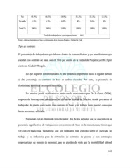 No 45.9% 66.2% 16.9% 51.2% 32.1% 12.5% No sabe 8.1% 6.2% 6.5% 4% 9.6% .0% Total % 100% 100% 100% 100% 100% 100% Total de trabajadores que respondieron: 661 Fuente: elaboración propia con base en información de la Encuesta Empleo y Calidad de Vida. Tipo de contrato El porcentaje de trabajadores que laboran dentro de la manufactura y que manifestaron que cuentan con contrato de base, son el 90.6 por ciento en la ciudad de Nogales y el 88.5 por ciento en Ciudad Obregón. Lo que sugieren estos resultados es una tendencia importante hacia la rigidez debido al alto porcentaje de contratos de base en ambas ciudades. Por tanto, la presencia de flexibilidad numérica externa es muy baja. Lo anterior puede explicarse en parte con lo mencionado por De la Garza (2006), respecto de las empresas manufactureras del sector formal en México, donde prevalece el trabajador de planta que cuenta con contrato de base, y el trabajo tanto parcial como por horas no es muy utilizado. Siguiendo con lo planteado por este autor, dos de los aspectos que se asocian con la presencia significativa de trabajadores con contrato de base en la manufactura, tienen que ver con el tradicional monopolio que los sindicatos han ejercido sobre el mercado de trabajo y su influencia para la obtención de contratos de planta; y con estrategias empresariales de manejo de personal, que no pierden de vista que la inestabilidad laboral 103