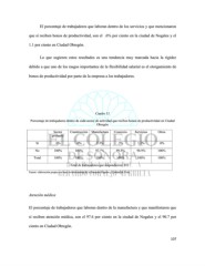 El porcentaje de trabajadores que laboran dentro de los servicios y que mencionaron que sí reciben bonos de productividad, son el .6% por ciento en la ciudad de Nogales y el 1.1 por ciento en Ciudad Obregón. Lo que sugieren estos resultados es una tendencia muy marcada hacia la rigidez debido a que uno de los rasgos importantes de la flexibilidad salarial es el otorgamiento de bonos de productividad por parte de la empresa a los trabajadores. Cuadro 12 Porcentaje de trabajadores dentro de cada sector de actividad que reciben bonos de productividad en Ciudad Obregón Sector Construcción Manufactura Comercio Servicios Otros primario Sí .0% .0% 2.3% .5% 1.1% .0% No 100% 100% 97.7% 99.5% 98.9% 100% Total 100% 100% 100% 100% 100% 100% Total de trabajadores que respondieron: 852 Fuente: elaboración propia con base en información de la Encuesta Empleo y Calidad de Vida. Atención médica El porcentaje de trabajadores que laboran dentro de la manufactura y que manifestaron que sí reciben atención médica, son el 97.6 por ciento en la ciudad de Nogales y el 90.7 por ciento en Ciudad Obregón. 107