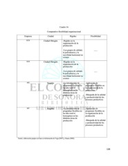 Cuadro 16 Comparativo flexibilidad organizacional Empresa Ciudad Rigidez Flexibilidad ECN Ciudad Obregón -Rigidez en la organización de la producción -Los grupos de calidad, ___ la polivalencia y la movilidad horizontal no existen ECE Ciudad Obregón -Rigidez en la organización de la producción -Los grupos de calidad, ___ la polivalencia y la movilidad horizontal no existen MX Nogales -La introducción de -Aplicación de programas flexibles no programas flexibles en ha sido total ni la organización de la homogénea en las producción distintas áreas de producción -Búsqueda de la calidad y productividad de los procesos productivos MY Nogales -La introducción de -Aplicación de programas flexibles no programas flexibles en ha sido total ni la organización de la homogénea en las producción distintas áreas de producción -Búsqueda de la calidad y productividad de los procesos productivos Fuente: elaboración propia con base en información de Vega (2007) y Osuna (2008). 128