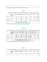 Fuente: elaboración propia con base en información de Vega (2007) y Osuna (2008). Cuadro 23 Porcentaje de trabajadores por sector de actividad que pertenecen o no a algún sindicato en Nogales Sector Construcción Manufactura Comercio Servicios Otros Total primario % Sí .0% .0% 28.6% .0% 70% 1.4% 100% No .2% 8.8% 39.6% 18.5% 32.5% .5% 100% No sabe .0% 5.7% 57.5% 16.1% 17.2% 3.4% 100% Total de trabajadores que respondieron: 736 Fuente: elaboración propia con base en información de la Encuesta Empleo y Calidad de Vida. Cuadro 24 Porcentaje de trabajadores por sector de actividad que pertenecen o no a algún sindicato en Ciudad Obregón Sector Construcción Manufactura Comercio Servicios Otros Total primario % Sí 4.1% 2.5% 26.2% 6.6% 59.8% 0.8% 100% No 6.1% 12.4% 17.2% 23% 40.2% 1.1% 100% No sabe 5.1% 6.3% 16.5% 13.9% 55.7% 2.5% 100% Total de trabajadores que respondieron: 661 Fuente: elaboración propia con base en información de la Encuesta Empleo y Calidad de Vida. Cuadro 25 Porcentaje de trabajadores por sector de actividad que cuentan o no con contrato por escrito en Nogales Sector Construcción Manufactura Comercio Servicios Otros Total primario % Sí .0% 2.2% 53.2% 12.5% 31.5% .6% 100% 135