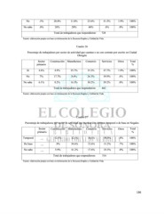 No .5% 20.8% 11.8% 23.6% 41.5% 1.9% 100% No sabe .0% 20% 20% 60% .0% .0% 100% Total de trabajadores que respondieron: 728 Fuente: elaboración propia con base en información de la Encuesta Empleo y Calidad de Vida. Cuadro 26 Porcentaje de trabajadores por sector de actividad que cuentan o no con contrato por escrito en Ciudad Obregón Sector Construcción Manufactura Comercio Servicios Otros Total primario % Sí 4.6% 4.9% 25.7% 15.2% 47.7% 1.9% 100% No 7% 17.7% 8.6% 26.3% 39.9% .4% 100% No sabe 6.1% 8.2% 16.3% 10.2% 59.2% .0% 100% Total de trabajadores que respondieron: 661 Fuente: elaboración propia con base en información de la Encuesta Empleo y Calidad de Vida. Cuadro 27 Porcentaje de trabajadores por sector de actividad que cuentan con contrato temporal o de base en Nogales Sector Construcción Manufactura Comercio Servicios Otros Total primario % Temporal __ 12.5% 32.1% 16.1% 39.3% .0% 100% De base __ .9% 54.6% 12.6% 31.2% .7% 100% No sabe __ 5.9% 41.2% 17.6% 35.3% .0% 100% Total de trabajadores que respondieron: 516 Fuente: elaboración propia con base en información de la Encuesta Empleo y Calidad de Vida. 136