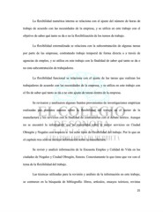 La flexibilidad numérica interna se relaciona con el ajuste del número de horas de trabajo de acuerdo con las necesidades de la empresa, y se utiliza en este trabajo con el objetivo de saber qué tanto se da o no la flexibilización de los turnos de trabajo. La flexibilidad externalizada se relaciona con la subcontratación de algunas tareas por parte de las empresas, contratando trabajo temporal de forma directa o a través de agencias de empleo, y se utiliza en este trabajo con la finalidad de saber qué tanto se da o no esta subcontratación de trabajadores. La flexibilidad funcional se relaciona con el ajuste de las tareas que realizan los trabajadores de acuerdo con las necesidades de la empresa, y se utiliza en este trabajo con el fin de saber qué tanto se da o no este ajuste de tareas dentro de la empresa. Se revisaron y analizaron algunas fuentes provenientes de investigaciones empíricas realizadas por distintos autores sobre la flexibilidad del trabajo en el sector de la manufactura y los servicios con la finalidad de contrastarlas con el debate teórico. Aunque no se encontró la información que se necesitaba sobre el sector servicios en Ciudad Obregón y Nogales con respecto a los ocho tipos de flexibilidad del trabajo. Por lo que en el capítulo tres sólo se incluye información sobre la manufactura. Se revisó y analizó información de la Encuesta Empleo y Calidad de Vida en las ciudades de Nogales y Ciudad Obregón, Sonora. Concretamente lo que tiene que ver con el tema de la flexibilidad del trabajo. Las técnicas utilizadas para la revisión y análisis de la información en este trabajo, se centraron en la búsqueda de bibliografía: libros, artículos, ensayos teóricos, revistas 25
