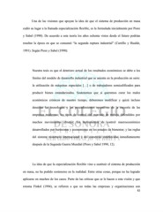 Una de las visiones que apoyan la idea de que el sistema de producción en masa cedió su lugar a la llamada especialización flexible, es la formulada inicialmente por Piore y Sabel (1990). De acuerdo a esta teoría los años ochenta vistos desde el futuro podrían resultar la época en que se consumó “la segunda ruptura industrial” (Carrillo y Hualde, 1991). Según Piore y Sabel (1990): Nuestra tesis es que el deterioro actual de los resultados económicos se debe a los límites del modelo de desarrollo industrial que se asienta en la producción en serie: la utilización de máquinas especiales […] o de trabajadores semicalificados para producir bienes estandarizados. Sostenemos que si queremos curar los males económicos crónicos de nuestro tiempo, deberemos modificar y quizá incluso desechar las tecnologías y los procedimientos operativos de la mayoría de las empresas modernas; los tipos de control del mercado de trabajo defendidos por muchos movimientos obreros; los instrumentos de control macroeconómico desarrollados por burócratas y economistas en los estados de bienestar; y las reglas del sistema monetario internacional y del comercial establecidas inmediatamente después de la Segunda Guerra Mundial (Piore y Sabel 1990, 12). La idea de que la especialización flexible vino a sustituir el sistema de producción en masa, no ha podido sostenerse en la realidad. Entre otras cosas, porque no ha logrado aplicarse en muchos de los casos. Parte de las críticas que se le hacen a esta visión y que retoma Finkel (1994), se refieren a que no todas las empresas y organizaciones son 42
