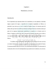 Capítulo II Manufactura y servicios Introducción Por la importancia que representa dentro de la manufactura, en este apartado se describen algunos aspectos del origen y desarrollo de la industria maquiladora en México, en particular lo que tiene que ver con la ciudad de Nogales, Sonora. Se menciona parte del debate sobre qué tanto ha existido una derrama tecnológica hacia las economías locales por parte de las empresas trasnacionales propietarias de maquilas en la frontera norte de México. También se retoma algo sobre la discusión del llamado upgrading, que se refiere a una supuesta evolución por generaciones de algunas de las maquilas en la frontera norte de México. Se señalan ciertas características relacionadas con la evolución del sector servicios en el plano internacional y nacional, en específico lo relacionado con el estado de Sonora. Se enumeran distintos tipos de servicios y sus características principales. Se retoma parte de la discusión sobre el nivel de interdependencia que pueden tener la industria y los servicios. 51
