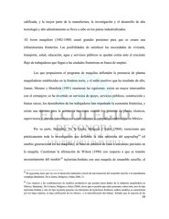 calificada, y la mayor parte de la manufactura, la investigación y el desarrollo de alta tecnología y alto adiestramiento se lleva a cabo en los países industrializados. -El boom maquilero (1982-1988) causó grandes presiones para que se creara una infraestructura fronteriza. Las posibilidades de satisfacer las necesidades de vivienda, transporte, salud, educación, agua y servicios públicos se quedan cortas ante el creciente flujo de trabajadores que llegan a las ciudades fronterizas en busca de empleo. Los que propusieron el programa de maquilas defienden la presencia de plantas maquiladoras establecidas en la frontera norte, y el saldo positivo qua ha resultado de ello; Jenner, Moreno y Mendiola (1991) enumeran las siguientes: existe un mayor intercambio con el extranjero; se ha invertido en servicios de apoyo, servicios públicos, construcción y bienes raíces; los desembolsos de los trabajadores han impulsado la economía fronteriza; y existe una derrama para la economía mexicana cuando los gerentes de planta, técnicos, supervisores y obreros transmiten sus conocimientos a compañías establecidas en México. Por su parte, Besdesky, De la Garza, Melgoza y Salas (2004), mencionan que 34 prácticamente toda la investigación que defiende la idea optimista del upgrading (el cambio generacional en las maquilas), se basa en estudios de caso o encuestas parciales en la maquila. Cuestionan la afirmación de Wilson (1996) con respecto a que se transite 35 necesariamente del modelo taylorista-fordista con una maquila de ensamble sencillo, al 34 El upgrading tiene que ver con el desarrollo industrial a través de una transición del ensamble sencillo a la manufactura compleja (Bendesky, De la Garza, Melgoza y Salas 2004, 3). 35 Con respecto a las combinaciones de modelos productivos que pueden darse dentro de la industria maquiladora en México, Bendesky, De la Garza, Melgoza y Salas (2004), dicen que es posible que estén presentes, sobre todo, uno de tipo taylorista-fordista y otro de tipo toyotista precario con elementos de taylorismo-fordismo; ambos modelos se caracterizan por los bajos salarios, la baja calificación de los obreros y la intensificación del trabajo. Señalan que la mayoría de las 59