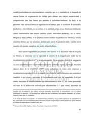 modelo postfordista con una manufactura compleja, que es el resultado de la búsqueda de nuevas formas de organización del trabajo para obtener una mayor productividad y competitividad ante los límites que presenta el taylorismo-fordismo. Es decir, sí se presentan estas nuevas formas de organización del trabajo, pero la evolución de un modelo productivo a otro distinto, no se sostiene en la realidad, porque no se abandonan totalmente ciertas características del modelo anterior. Como mencionan Bendesky, De la Garza, Melgoza y Salas (2004), en la práctica existen modelos de producción híbridos y resulta simplista afirmar que las presiones globales para elevar la productividad y calidad en la maquila sólo puedan cumplirse por medio del posfordismo. Otro aspecto importante que retoman estos autores en la discusión sobre la maquila en México, se relaciona con la capacidad de arrastre de la maquila por medio de los 36 encadenamientos productivos o la subcontratación. En su opinión, el nivel de integración de estos encadenamientos o subcontratación con las economías locales, son bajos. Muestran 37 algunos datos de la ENESTYC (1999) sobre indicadores de redes entre empresas y encadenamientos productivos en la maquila: porcentaje de establecimientos que contrataron maquilas 18 por ciento; porcentaje de la producción total que fue maquilada 10.44 por ciento; porcentaje de establecimientos que subcontrataron a otros 4.2 por ciento; porcentaje del valor de la producción realizada por subcontratistas 1.57 por ciento; porcentaje de maquilas son ensambladoras que utilizan tecnología intermedia (maquinizada no automatizada), casi no realizan investigación ni desarrollo, y la tecnología que aplican más bien la obtienen de sus matrices (Bendesky, De la Garza, Melgoza y Salas 2004, 31-34 passim). 36 En el caso de Sonora con respecto a los encadenamientos productivos, Vázquez (2006) apunta que las maquiladoras no han logrado jalar a los inversionistas locales y nacionales para que se enganchen en cadenas productivas que se sustenten en insumos de origen regional (Vázquez 2006, 246). 37 Encuesta Nacional de Empleos, Salario, Tecnología y Capacitación del INEGI. 60