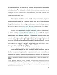 por ciento laboraba para este sector. En los siguientes años la experiencia de los demás 40 países desarrollados es similar a la de Estados Unidos gracias al desarrollo de nuevas tecnologías que elevan la producción de bienes industriales junto con la revolución de la producción flexible (Garza, 2006). Otros aspectos importantes que han influido para que los servicios tengan una mayor presencia y demanda en la economía global, tienen que ver con los cambios demográficos, los estilos de vida y los ingresos más elevados de la población, que requieren de una mayor cobertura de servicios de salud, educación y entretenimiento (Garza, 2006). Dombois (2002) apunta que las formas de organización productiva de la sociedad y las formas de trabajo y empleo han ido cambiando en las sociedades de temprana industrialización hacia sociedades de servicios. La participación del sector servicios en la economía se ha incrementado y la del sector industrial ha disminuido: las labores de producción, manuales o mecanizadas, pierden importancia frente a actividades en el área de la investigación y el desarrollo; y muchas de las actividades dentro de la industria pasan a formar parte de los servicios (Dombois, 2002). Como parte del desarrollo del sector servicios en México, Ortiz (2006) divide en dos fases este proceso. La primera fase se presenta desde los años cuarenta hasta el agotamiento del modelo de sustitución de importaciones, se caracteriza por un proceso de dentro de las organizaciones o empresas; y 3) los servicios que tienen que ver con lo público, como educación, salud y seguridad. 40 Como señala Garza (2006) sobre los países desarrollados, sus grandes empresas trasnacionales conservan las actividades de investigación y desarrollo en sus lugares de origen, y reubican sus plantas manufactureras en algunos países subdesarrollados, que son el sitio en el que estas empresas realizan el proceso manufacturero y extraen tanto las materias primas como los energéticos, por lo que resulta improbable que evolucionen hacia una etapa con servicios globalmente competitivos (Garza 2006, 60). 65