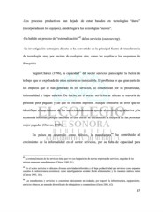 -Los procesos productivos han dejado de estar basados en tecnologías “duras” (incorporadas en los equipos), dando lugar a las tecnologías “suaves”. 42 -Ha habido un proceso de “externalización” de los servicios (outsourcing). -La investigación extranjera directa se ha convertido en la principal fuente de transferencia de tecnología, muy por encima de cualquier otra, como las regalías o los esquemas de franquicia. Según Chávez (1996), la capacidad del sector servicios para captar la fuerza de 43 trabajo que es expulsada de otros sectores es indiscutible. El problema es que gran parte de los empleos que se han generado en los servicios, se caracterizan por su precariedad, informalidad y bajos salarios. De hecho, en el sector servicios se ubican la mayoría de personas peor pagadas y las que no reciben ingresos. Aunque considera un error que se identifique el crecimiento de los servicios únicamente con la absorción improductiva y la economía informal, porque también en este sector se encuentran la mayoría de las personas mejor pagadas (Chávez, 1995). 44 En países en desarrollo como México, la manufactura ha contribuido al crecimiento de la informalidad en el sector servicios, por su falta de capacidad para 42 La externalización de los servicios tiene que ver con la aparición de nuevas empresas de servicios, surgidas de las mismas empresas manufactureras (Chávez 1995, 31). 43 En el sector servicios se ubicaron diversas actividades informales y de baja productividad que sirvieron como espacios sociales de sobrevivencia económica: como amortiguadores sociales frente al desempleo y los menores salarios reales (Chávez 1995, 165). 44 Las manufacturas y servicios se concentran básicamente en ciudades, por requerir la infraestructura, equipamiento, servicios urbanos, un mercado diversificado de trabajadores y consumidores (Garza 2006, 62). 67