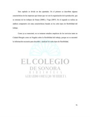 Este capítulo se divide en dos apartados. En el primero se describen algunas características de las empresas que tienen que ver con la organización de la producción, que se retoman de los trabajos de Osuna (2008) y Vega (2007). En el segundo se realiza un análisis comparativo de estas características basado en los ocho tipos de flexibilidad del trabajo. Como ya se mencionó, no se tomaron estudios empíricos de los servicios tanto en Ciudad Obregón como en Nogales sobre la flexibilidad del trabajo, porque no se encontró la información necesaria para describir y analizar los ocho tipos de flexibilidad. 75