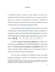 Resumen 1 La flexibilidad del trabajo se relaciona de manera importante con muchas de las organizaciones alrededor del mundo. Su aplicación dentro de las empresas ha variado en tiempo, forma y resultados. Las consecuencias para las empresas, los trabajadores, los sindicatos y el Estado, han sido tanto positivas como negativas, dependiendo de las teorías y referentes empíricos que se utilicen para su interpretación y análisis. En esta investigación se realiza un comparativo entre la manufactura y los servicios en Ciudad Obregón y Nogales, Sonora. Para el análisis se utilizan dos tipologías de la flexibilidad del trabajo, el concepto de rigidez referido al ámbito laboral, la teoría de la segmentación del mercado de trabajo y aspectos que tienen que ver con el control y regulación del trabajo. Sin embargo, para el caso de los servicios en Ciudad Obregón y Nogales, que en teoría formaría parte del capítulo tres, no se encontró la información que se esperaba para realizar el comparativo con base en dos tipologías de la flexibilidad del trabajo. En este sentido, no fue posible comprobar la hipótesis, como era la idea original. Por tanto, en el capítulo tres sólo aparece lo relacionado con la manufactura. La idea de retomar una tipología de la flexibilidad del trabajo como principal herramienta de análisis para el comparativo de la manufactura y los servicios, permitió 1 Covarrubias (1992) menciona que a pesar de no existir un concepto universalmente aceptado sobre lo que se entiende por flexibilidad, este concepto se relaciona con los esfuerzos del capital para eliminar los obstáculos que interfieren en la productividad, competitividad y calidad de las empresas (Covarrubias, 1992) 8