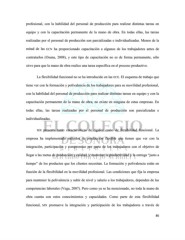 profesional, con la habilidad del personal de producción para realizar distintas tareas en equipo y con la capacitación permanente de la mano de obra. En todas ellas, las tareas realizadas por el personal de producción son parcializadas e individualizadas. Menos de la mitad de las ECN ha proporcionado capacitación a algunos de los trabajadores antes de contratarlos (Osuna, 2008), y este tipo de capacitación no es de forma permanente, sólo sirve para que la mano de obra realice una tarea específica en el proceso productivo. La flexibilidad funcional no se ha introducido en las ECE. El esquema de trabajo que tiene ver con la formación y polivalencia de los trabajadores para su movilidad profesional, con la habilidad del personal de producción para realizar distintas tareas en equipo y con la capacitación permanente de la mano de obra, no existe en ninguna de estas empresas. En todas ellas, las tareas realizadas por el personal de producción son parcializadas e individualizadas. MX presenta tanto características de rigidez como de flexibilidad funcional. La empresa ha implementado métodos de producción flexible que tienen que ver con la integración, participación y compromiso por parte de los trabajadores con el objetivo de llegar a las metas de producción y calidad, y mantener la productividad y la entrega “justo a tiempo” de los productos que los clientes necesitan. La formación y polivalencia están en función de la flexibilidad en la movilidad profesional. Las condiciones que fija la empresa para mantener la polivalencia y subir de nivel y salario a los trabajadores, dependen de las competencias laborales (Vega, 2007). Pero como ya se ha mencionado, no toda la mano de obra cuenta con estos conocimientos y capacidades. Como parte de esta flexibilidad funcional, MX promueve la integración y participación de los trabajadores a través de 86