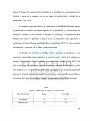 grupos de trabajo. Se necesita que los trabajadores se identifiquen y comprometan con la filosofía y metas de la empresa, con tal de lograr la productividad y calidad de la producción (Vega, 2007). MY presentan tanto características de rigidez como de flexibilidad funcional, porque la posibilidad de ascender de puesto depende de la polivalencia y certificaciones del trabajador. También se toma en cuenta la disciplina, la asistencia y la disponibilidad para trabajar horas extras. El problema es que no todos los trabajadores están capacitados y certificados, ni tienen el tiempo para trabajar horas extras (Vega, 2007). Por tanto, se tienen que mantener y conformar con el puesto y salario que tienen. MY fomenta las relaciones de trabajo entre el personal de producción y sus superiores, organizando eventos deportivos y convivios dentro y fuera de la empresa, se premian y reconocen los buenos resultados en productividad y calidad (Vega, 2007). Con ello se busca que los trabajadores establezcan relaciones afectivas con la empresa y sean más productivos en sus tareas (Vega, 2007). Esto como parte de una estrategia empresarial para que el personal se sienta más identificado, motivado y comprometido con su trabajo y la empresa. Son parte de los “hábitos flexibles” que promueve la flexibilidad funcional. Cuadro 1 Rigidez y flexibilidad en las empresas de capital nacional Tipo de flexibilidad Rigidez Flexibilidad Tecnológica Sí No Organizacional Sí No 87